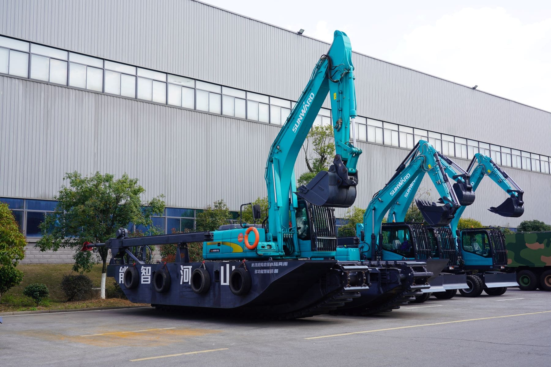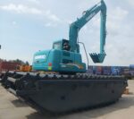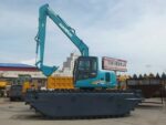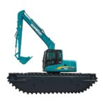 Экскаватор-амфибия SWE150SD — современная спецтехника, предназначенная для эффективной работы как на суше, так и в условиях болотистой местности и мелководья. Конструкция машины разработана с учетом повышенных требований к надежности и производительности: герметичные трапециевидные гусеницы и плавающая рама-катамаран обеспечивают устойчивость и высокую проходимость на сложных грунтах и водной поверхности. SWE150SD оснащен двигателем Yuchai мощностью 56,5 кВт (2200 об/мин) и эффективной гидравликой. Удлинённая стрела дает рабочую глубину до 6250 мм, а ковш объёмом 0,28 м³ позволяет уверенно выполнять широкий спектр задач. При весе 15 тонн SWE150SD — универсальное решение для строительства, мелиорации и дноуглубительных работ.
