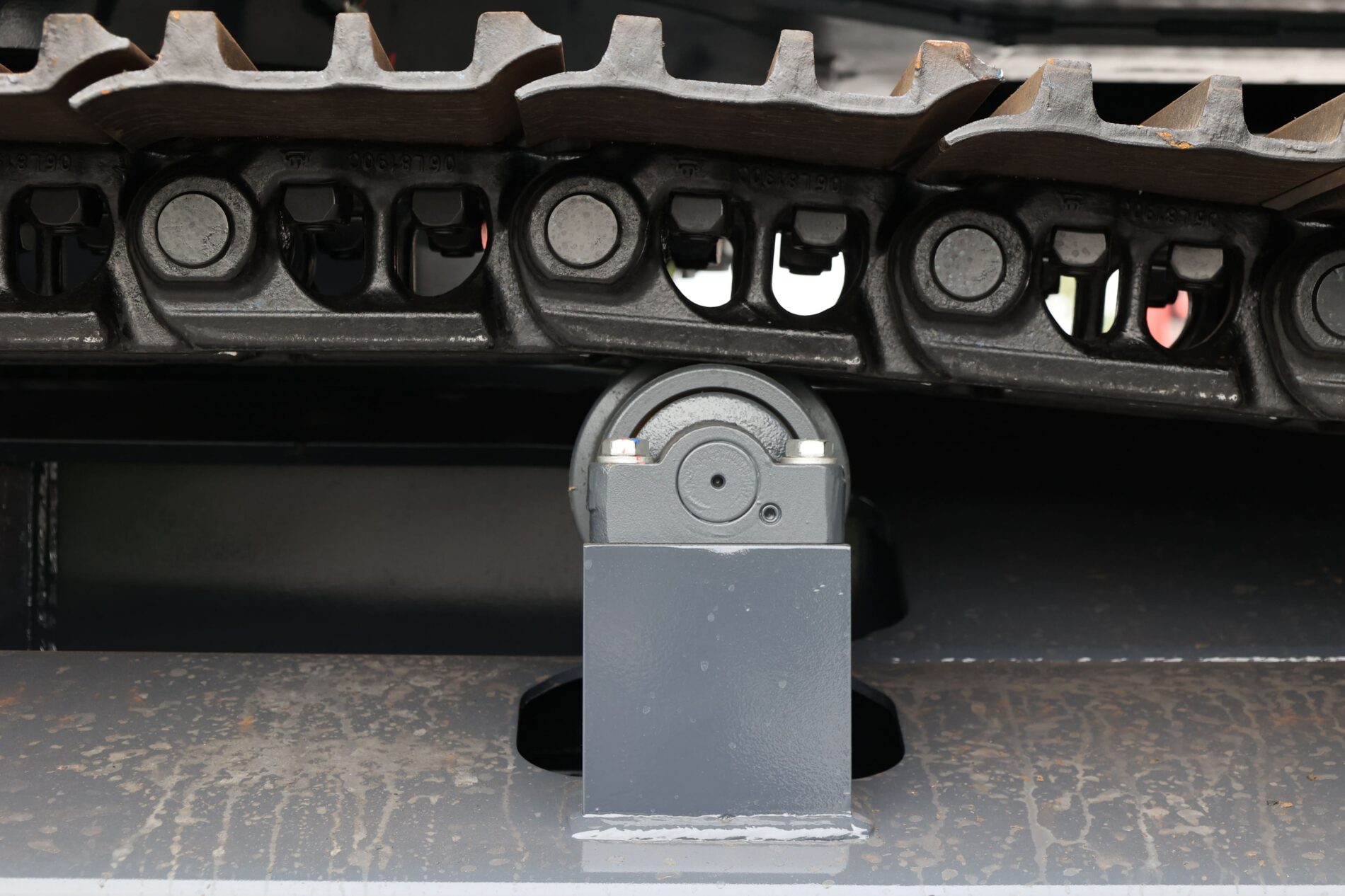 Конструкция ходовой части включает двухопорные поддерживающие ролики и девять опорных катков с каждой стороны. Это формирует увеличенный опорный контур и повышает устойчивость и проходимость техники на сложных участках.